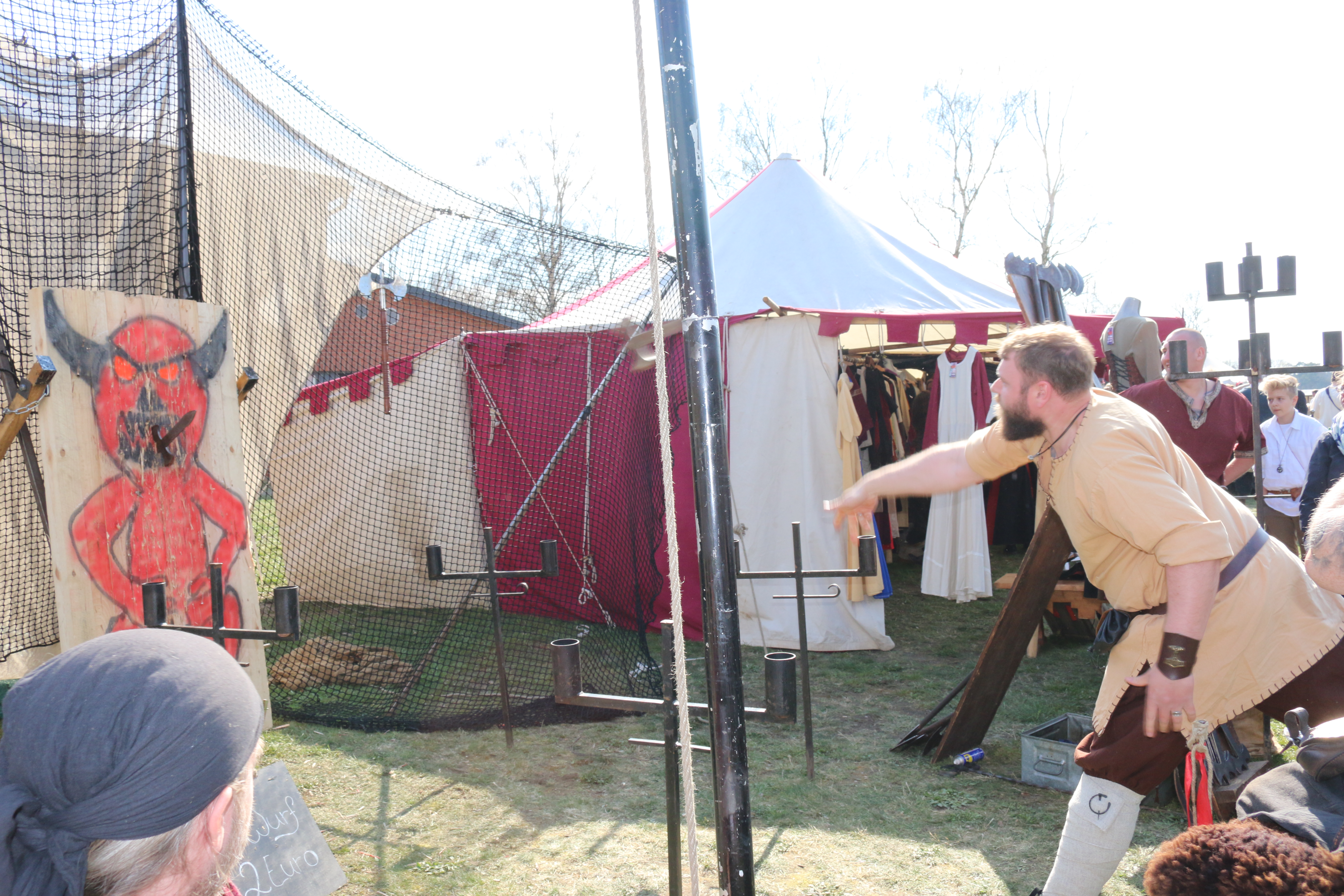 Die Season startete in Luhmühlen, mit blauem Himmel und einem gut gelaunten Wolfsrudel. Otto hat in dieser Saison zum ersten Mal Beschläge für seine Holzräder bekommen. Die erste Version dieser Beschläge bedarf zwar noch ein paar Verbesserungen, die Wölfe sind aber zuversichtlich das in den Griff zu bekommen. Ein Höhepunkt des Tages war die Teilnahme von Moh´s Taverne an dem Axtwurfturnier bei Knuts Axtwurfstand. Nachdem er fast alle Gegner in Grund und Boden geworfen hat, stand er mit dem letzen Kontrahenten im Finale. Es folgte ein nervenaufreibendes Finale, imdem er nur Haarscharf am Sieg vorbei schlitterte. Ein wohlverdienter zweiter Platz und nettes Gespräch mit Knut waren die Folge. Es war nicht das letze Turnier, Moh wird wiederkommen und dann Knuts Holzplatten entgültig in Bruch und Splitter zerlegen. ;-)