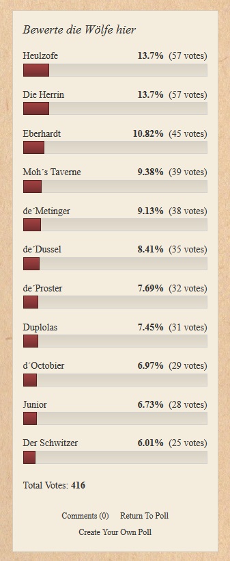 Sollte euer Wolf nicht gewonnen haben schaut bald wieder rein, den auch im nächsten Jahr gilt es wieder einen Topwolf zu küren. ;-)