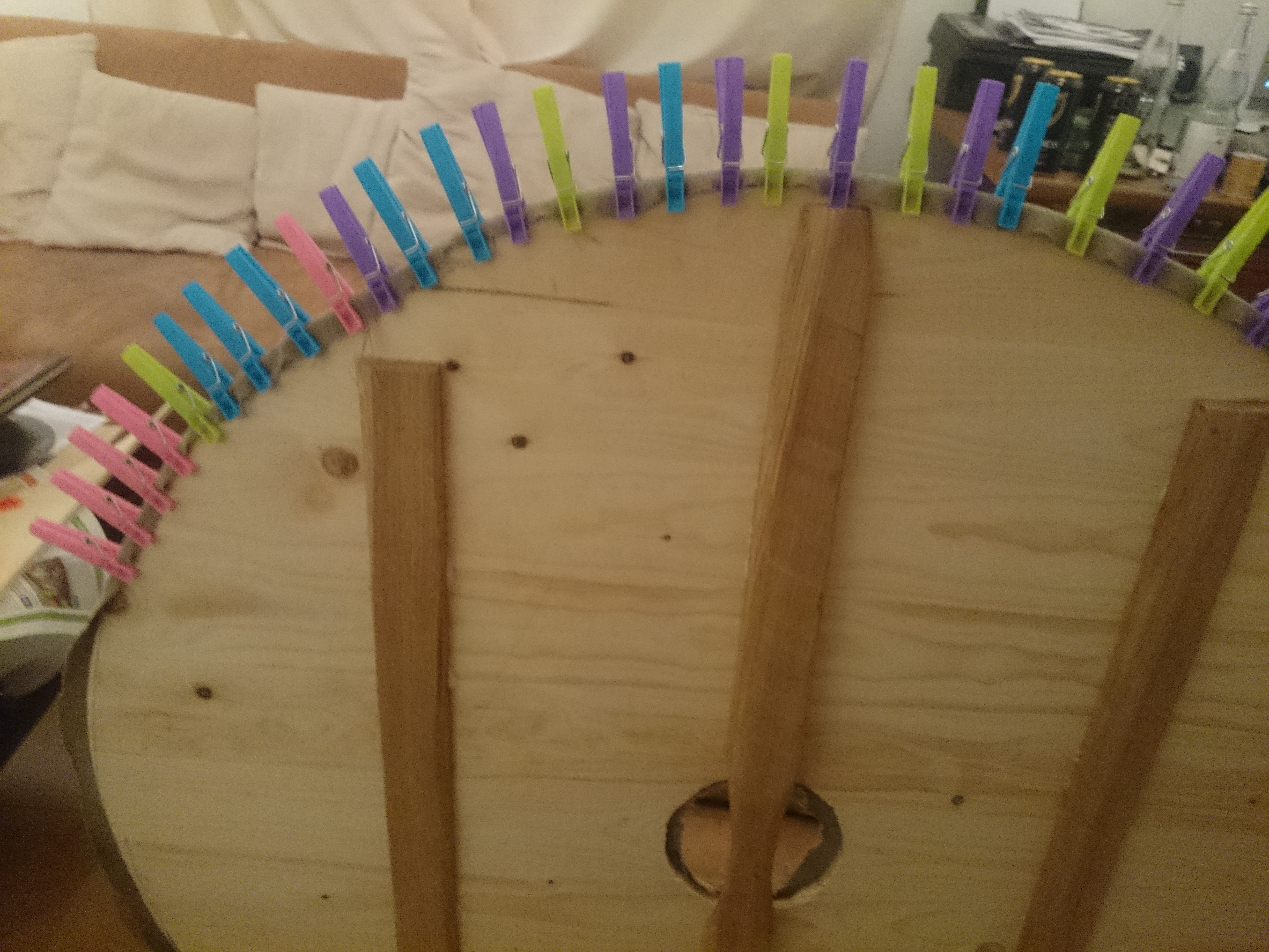 sich und konnte die Holzplatte nun mit den Leinen bespannen. Danach schnitzte er aus